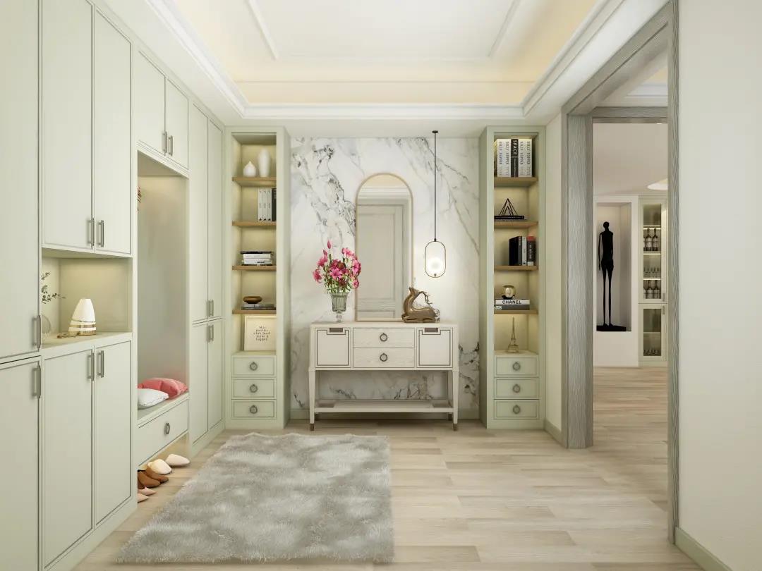 正前方是艺术大理石搭配仿古白移动玄关柜,